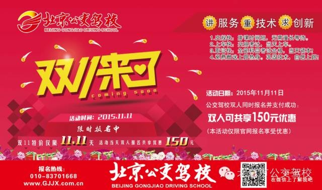 感謝各位學員,朋友對公交駕校一如既往的關注與支持,在雙11來臨之際,我校特推出學車限時巨惠大放送。價格直降到底,狂歡盛宴不容錯過,時間有限,報名從速!
