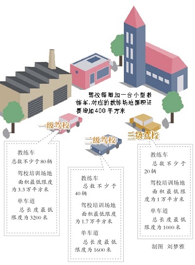 在駕校改造過程中,若要達到一級駕校標準,教練車總數不得少于80輛,二級的不少于40輛,三級的不少于20輛。不僅如此,駕校培訓場地面積也有“硬杠杠”,以小型汽車培訓為例,三個級別的駕校,其教練場地總面積最低分別得達到3.3萬㎡、1.7萬㎡、1萬㎡,單車道總長度最低限度分別為3200米、1600米和1000米。駕校每增加一臺小型教練車,對應的教練場地面積還要增加400平方米。大客、牽引車等車型的要求更高。
