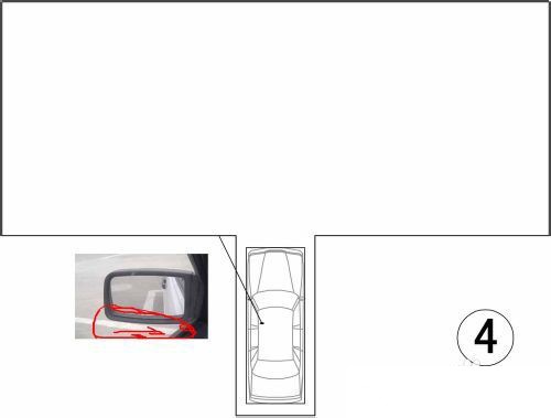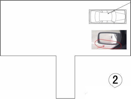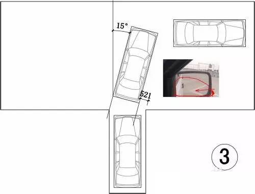 當車開到如圖位置:車身偏斜15度左右,從右反光鏡看車身與車庫線距離如圖,可以辨別車可以進入車庫,方向不變,繼續倒車。