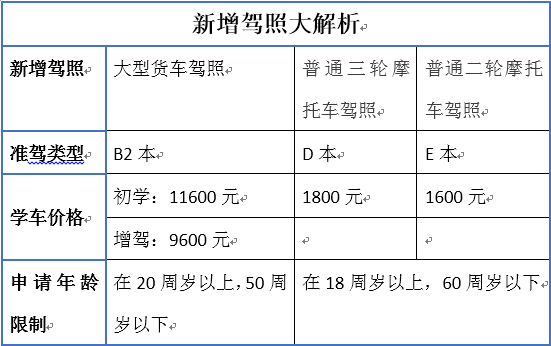 北京公交駕校為滿足各類車型駕駛員的需求,在原C1、C2、A1、A2駕駛?cè)伺嘤枠I(yè)務(wù)的基礎(chǔ)上,新增駕駛證B2(大型貨車)、D(普通三輪摩托車)、E(普通二輪摩托車)培訓業(yè)務(wù),需報名者請撥打電話:010-51650830
