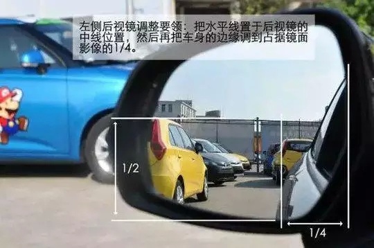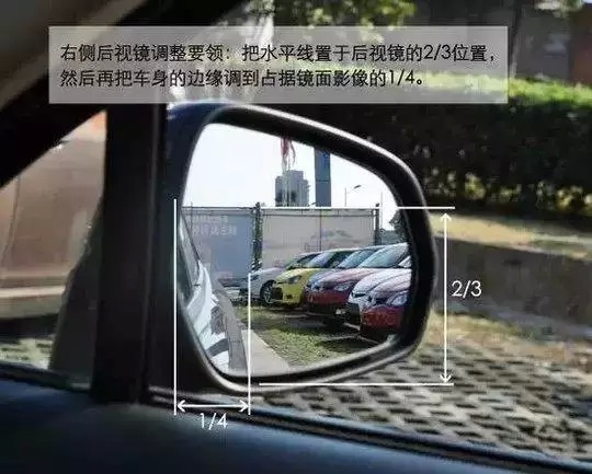 由于駕駛座位在左側(cè),所以司機對車身右側(cè)的情況較難掌握,因此,右側(cè)后視鏡在調(diào)整上、下位置時,地面面積應(yīng)大些,約占鏡面面積的2/3,而左、右位置則同樣調(diào)整至車身占據(jù)鏡面范圍的1/4。