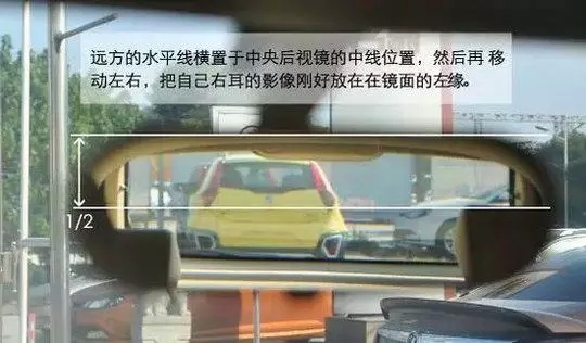 左、右位置調(diào)整至鏡面的左側(cè)邊緣,切至自己在鏡中影像的右耳際,一般情況下,從中央后視鏡里看不到自己,而上、下位置則是把遠(yuǎn)處的地平線置于鏡面中央。調(diào)整要領(lǐng)是:水平擺中間、耳際放左邊,即遠(yuǎn)方的水平線橫置于中央后視鏡的中線位置,然后再移動左右,把自己右耳的影像放在鏡面的左緣。